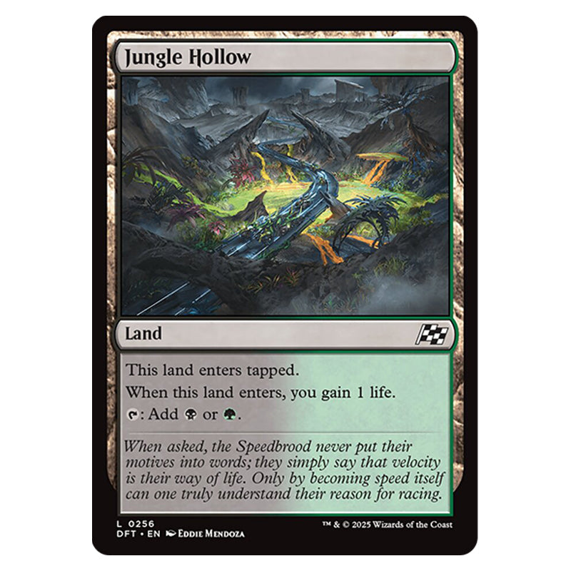 Jungle Hollow is a Common, Land card from the Magic The Gathering set Aetherdrift (MTGSC-DFT-0256)