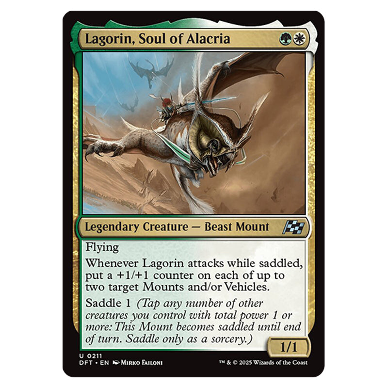 Flying Whenever Lagorin attacks while saddled, put a +1/+1 counter on each of up to two target Mounts and/or Vehicles. Saddle 1 (Tap any number of other creatures you control with total power 1 or more: This Mount becomes saddled until end of turn. Saddle only as a sorcery.)