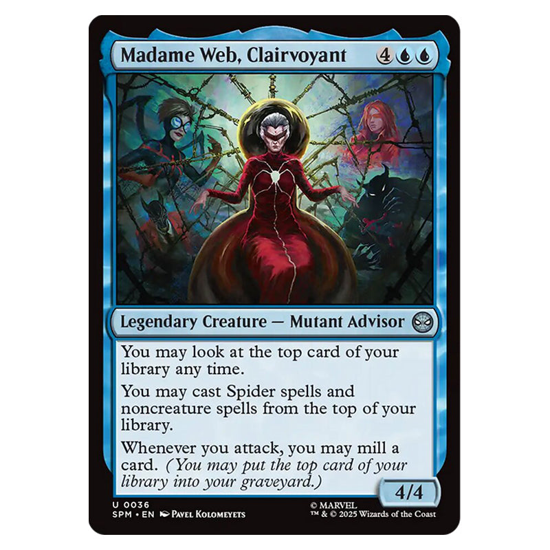 Madame Web, Clairvoyant is a Uncommon, Legendary Creature - Mutant Advisor card from the Magic The Gathering set Marvel's Spider-Man (MTGSC-SPM-0036)