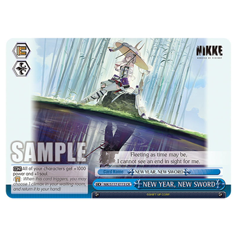 NEW YEAR, NEW SWORD is a CR Blue Climax card from the Weiss Schwarz set GODDESS OF VICTORY: NIKKE (WSSC-NIK/S117-E113) 【CONT】 All of your characters get +1000 power and +1 soul. (: When this card triggers, you may choose 1 climax in your waiting room, and return it to your hand)