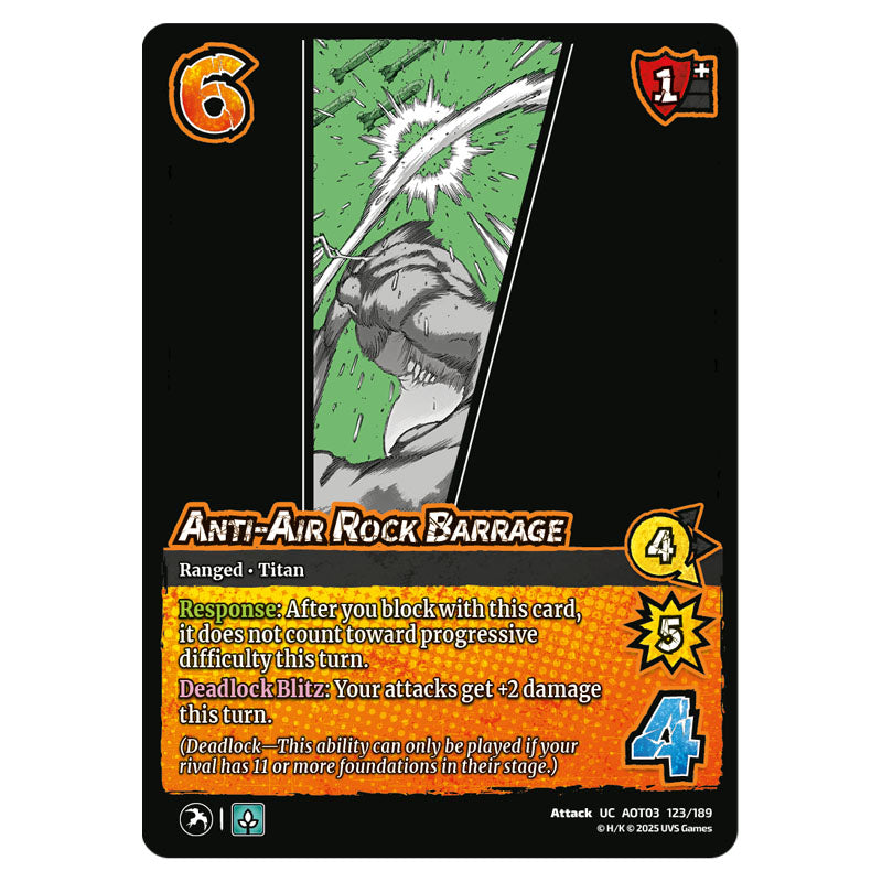 Anti-Air Rock Barrage is a Normal card from the Attack on Titan set Apocalypse UC 03 123/189
