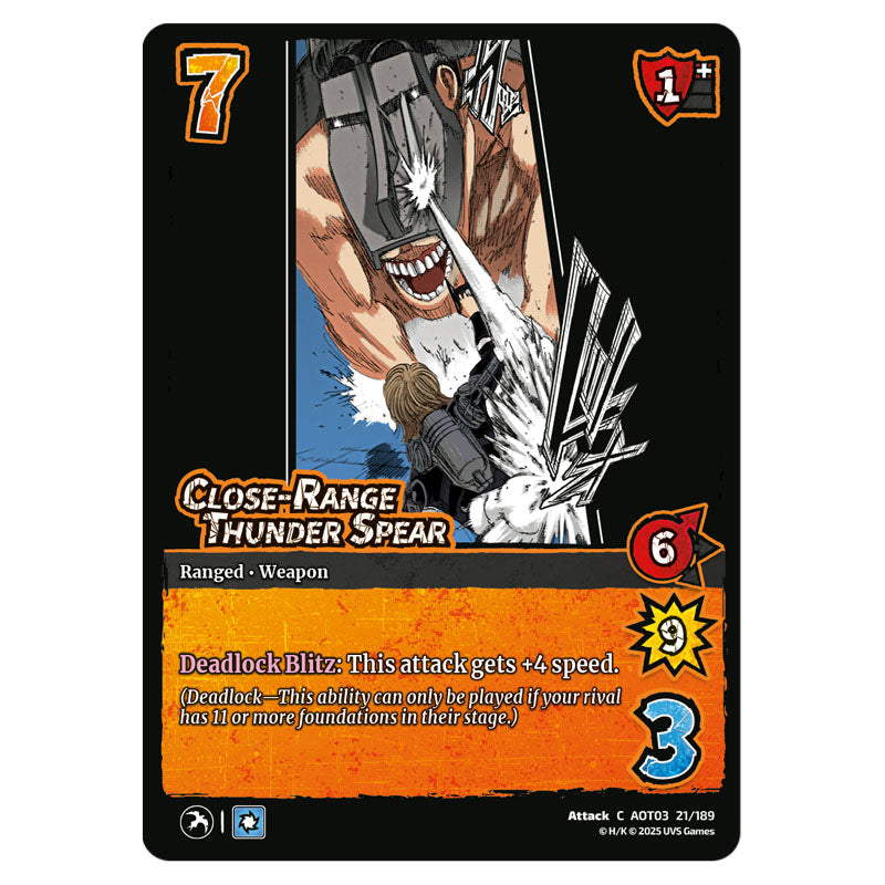 Close-Range Thunder Spear is a Normal card from the Attack on Titan set Apocalypse C 03 021/189