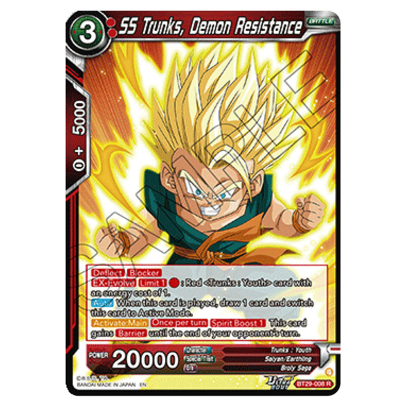 SS Trunks, Demon Resistance is a Rare, BATTLE card from the Dragon Ball Super set Fearsome Rivals (BT29-008)