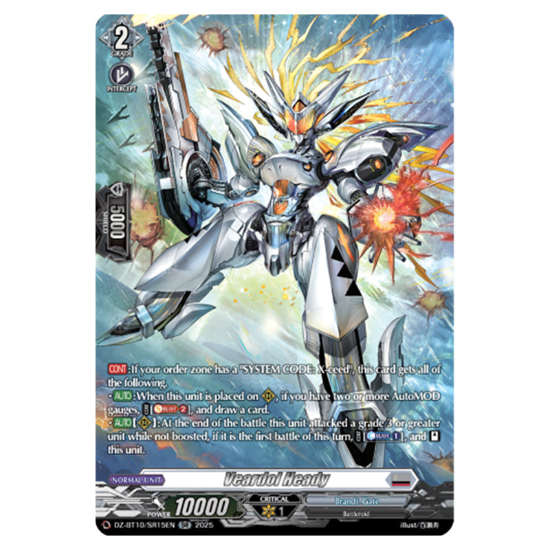 [CONT]:If your order zone has a "SYSTEM CODE: X-ceed", this card gets all of the following. ・[AUTO]:When this unit is placed on (RC), if you have two or more AutoMOD gauges, [COST][Soul-Blast 2], and draw a card. ・[AUTO](RC):At the end of the battle this unit attacked a grade 3 or greater unit while not boosted, if it is the first battle of this turn, [COST][Counter-Blast 1], and [Stand] this unit.