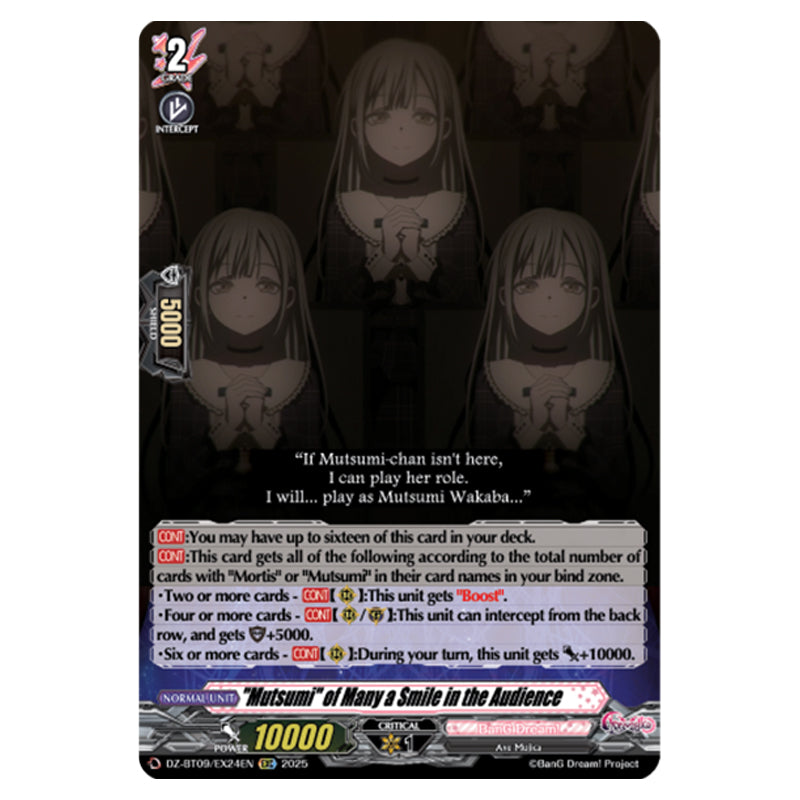 [CONT]:You may have up to sixteen of this card in your deck. [CONT]:This card gets all of the following according to the total number of cards with "Mortis" or "Mutsumi" in their card names in your bind zone. ・Two or more cards - [CONT](RC):This unit gets "Boost". ・Four or more cards - [CONT](RC)/(GC):This unit can intercept from the back row, and gets [Shield]+5000. ・Six or more cards - [CONT](RC):During your turn, this unit gets [Power]+10000.