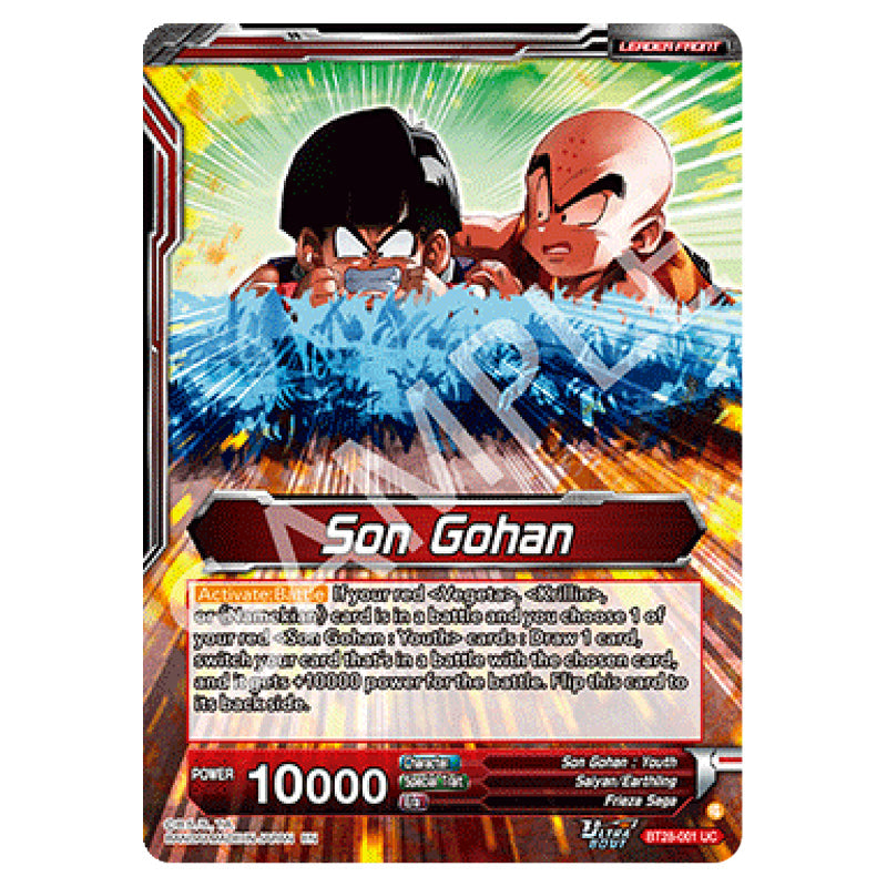 Son Gohan // Son Gohan, Protecting the Weak is a Uncommon, LEADER card from the Dragon Ball Super set Prismatic Clash (B28-001)