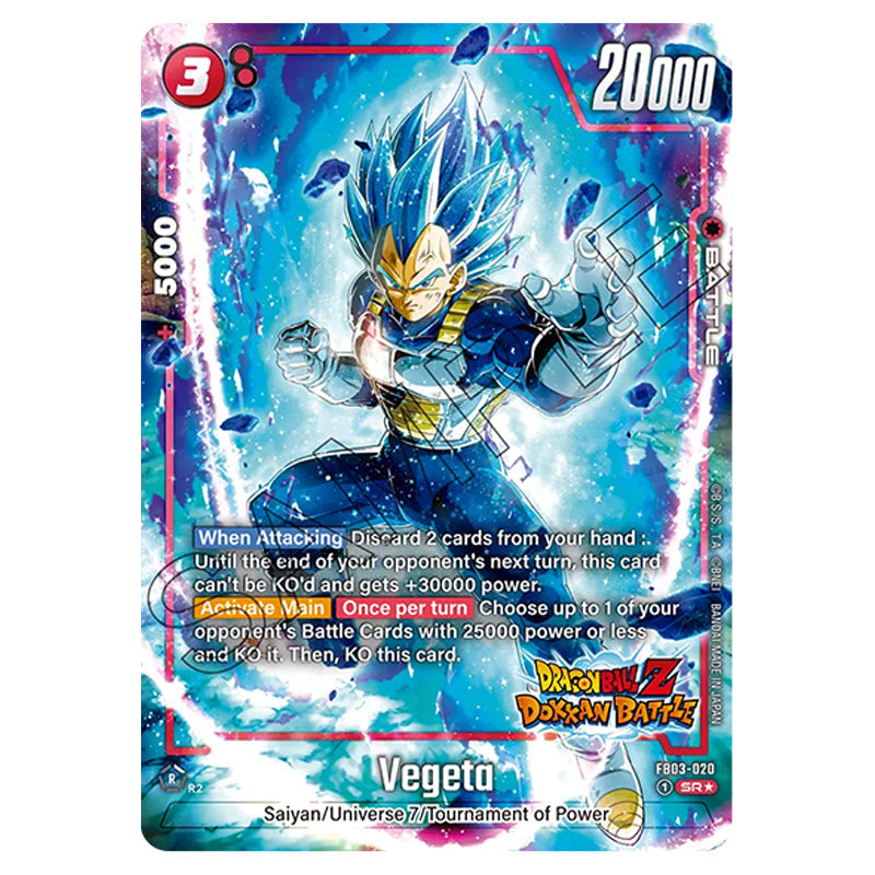Vegeta is a Super Rare, BATTLE card from the Dragon Ball Super Fusion World set FB05 - New Adventure (FB03-020)