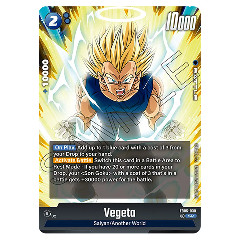 Vegeta is a Super Rare, BATTLE card from the Dragon Ball Super Fusion World set FB05 - New Adventure (FB05-038)
