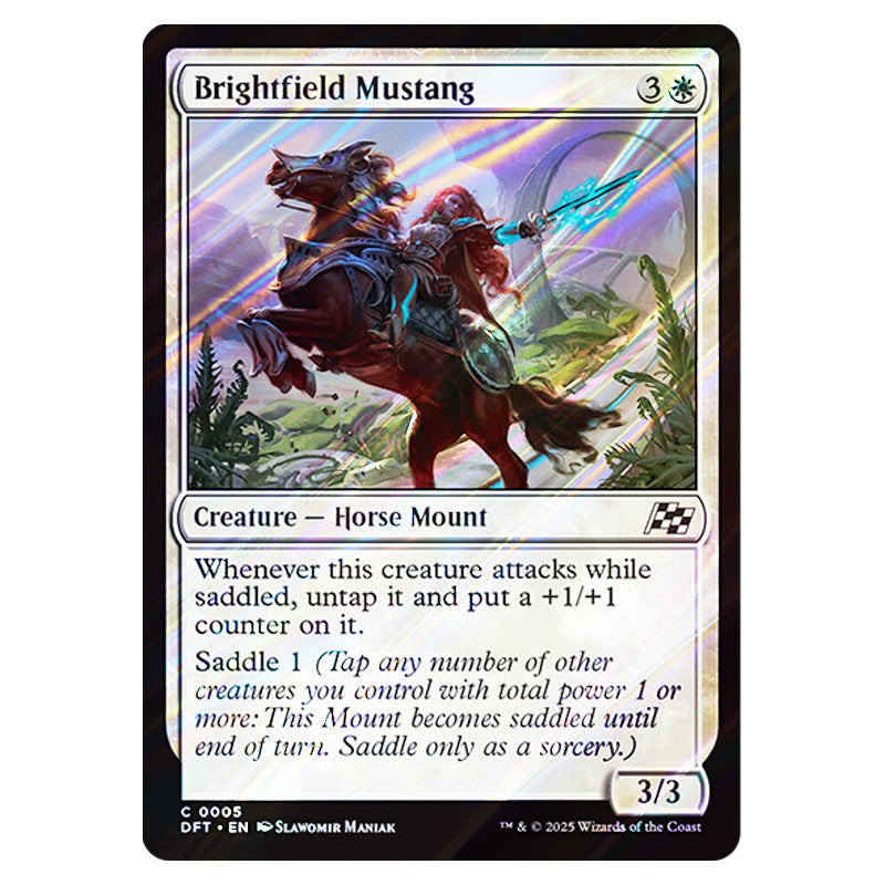 Brightfield Mustang is a Common, Creature - Horse Mount card from the Magic The Gathering set Aetherdrift (MTGSC-DFT-0005)