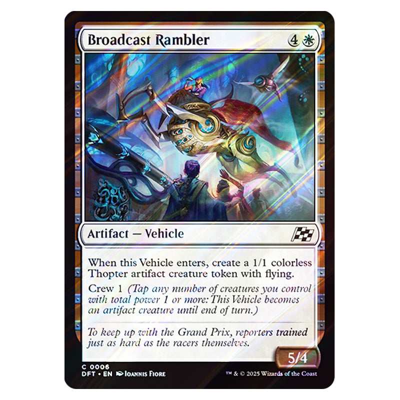Broadcast Rambler is a Common, Artifact - Vehicle card from the Magic The Gathering set Aetherdrift (MTGSC-DFT-0006)