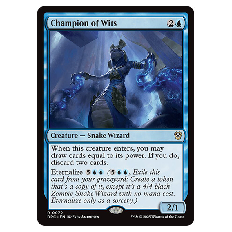 Champion of Wits is a Rare, Creature - Snake Wizard card from the Magic The Gathering set Aetherdrift Commander (MTGSC-DRC-0072)