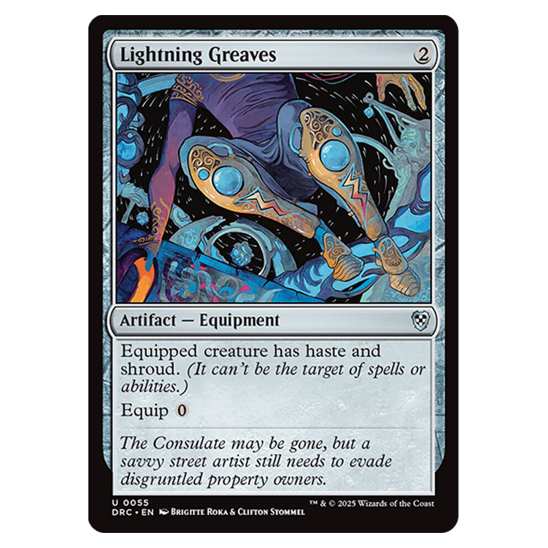Lightning Greaves is a Uncommon, Artifact - Equipment card from the Magic The Gathering set Aetherdrift Commander (MTGSC-DRC-0055)
