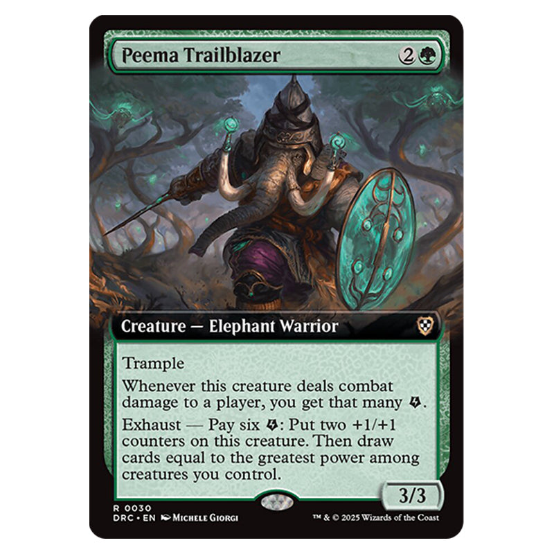 Peema Trailblazer is a Rare, Creature - Elephant Warrior card from the Magic The Gathering set Aetherdrift Commander (MTGSC-DRC-0030)