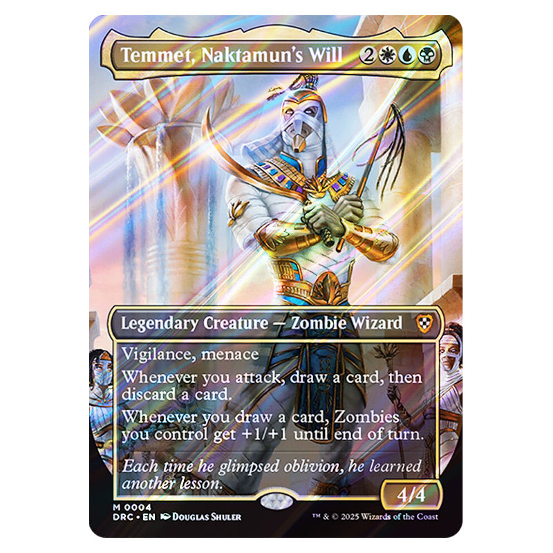 Temmet, Naktamun's Will is a Mythic, Legendary Creature - Zombie Wizard card from the Magic The Gathering set Aetherdrift Commander (MTGSC-DRC-0004)
