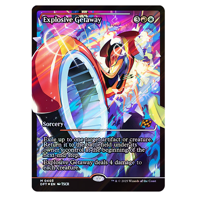 Explosive Getaway is a Mythic, Sorcery card from the Magic The Gathering set Aetherdrift (MTGSC-DFT-0403)