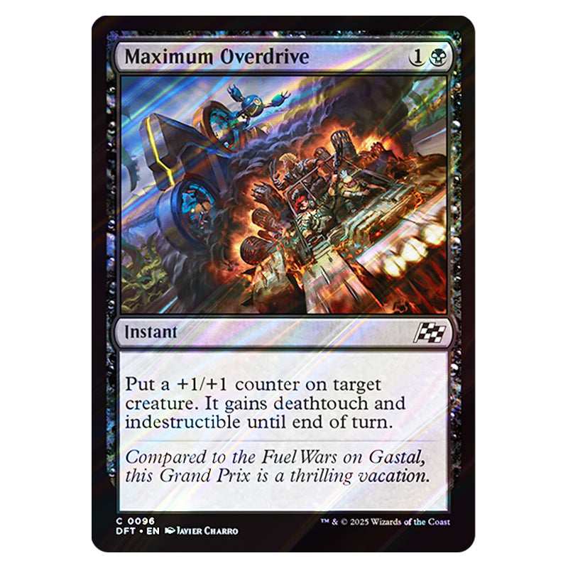 Maximum Overdrive is a Common, Instant card from the Magic The Gathering set Aetherdrift (MTGSC-DFT-0096)