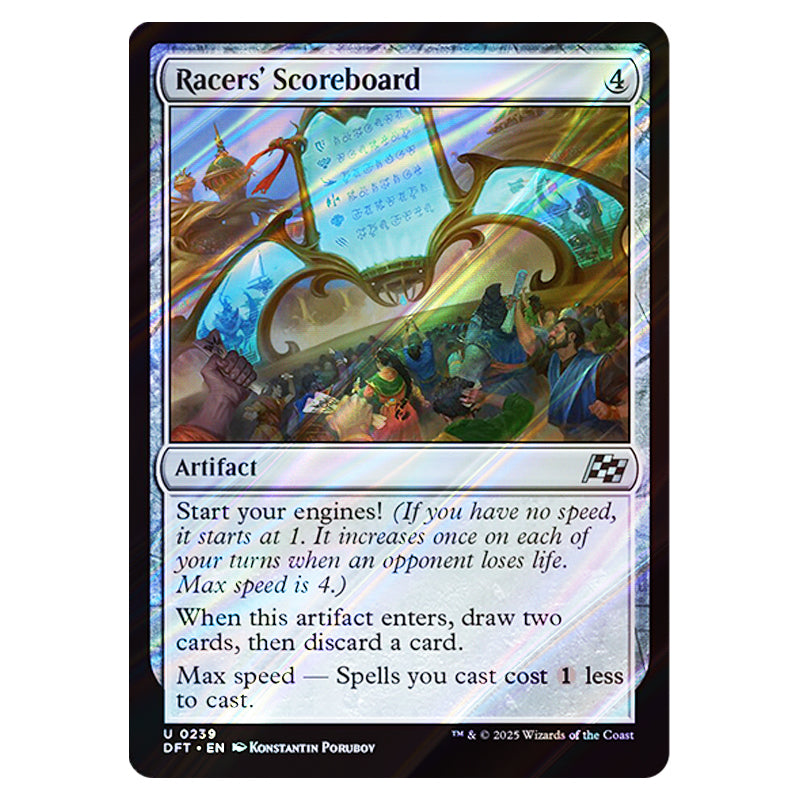 Racers' Scoreboard is a Uncommon, Artifact card from the Magic The Gathering set Aetherdrift (MTGSC-DFT-0239)