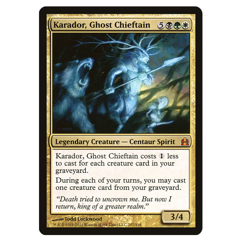 Karador, Ghost Chieftain is a Mythic, Legendary Creature - Centaur Spirit card from the Magic The Gathering set Commander 2011 (MTGSC-CMD-207)
