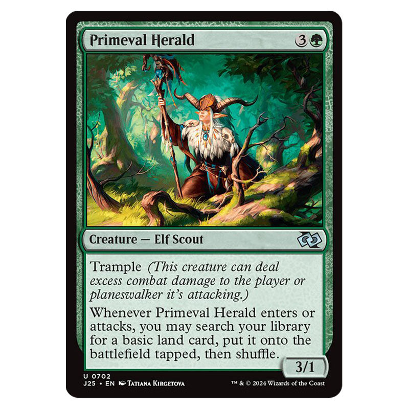 Primeval Herald is a Uncommon, Creature - Elf Scout card from the Magic The Gathering set Foundations Jumpstart (MTGSC-J25-0702)