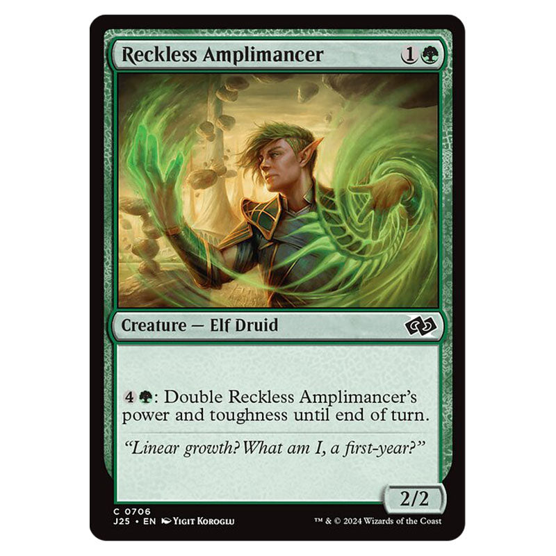 Reckless Amplimancer is a Common, Creature - Elf Druid card from the Magic The Gathering set Foundations Jumpstart (MTGSC-J25-0706)