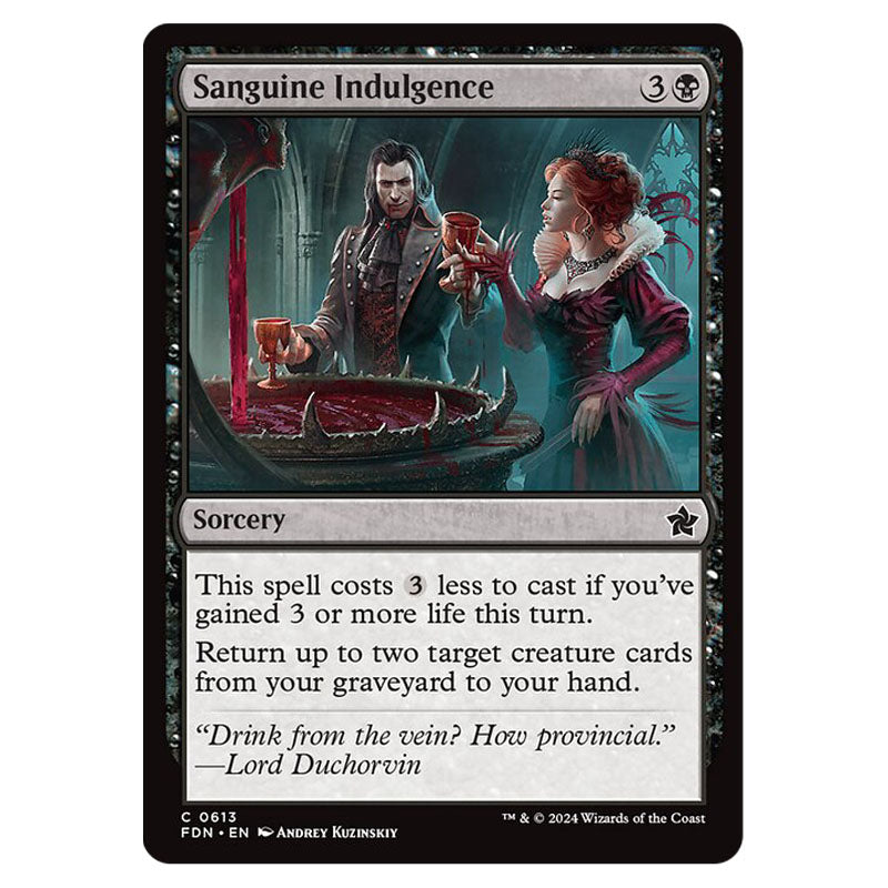 Sanguine Indulgence is a Common, Sorcery card from the Magic The Gathering set Foundations (MTGSC-FDN-0613)