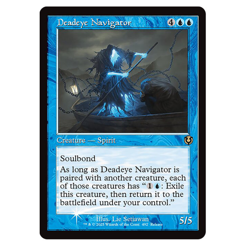 Soulbond (You may pair this creature with another unpaired creature when either enters. They remain paired for as long as you control both of them.) As long as Deadeye Navigator is paired with another creature, each of those creatures has "{1}{U}: Exile this creature, then return it to the battlefield under your control."
