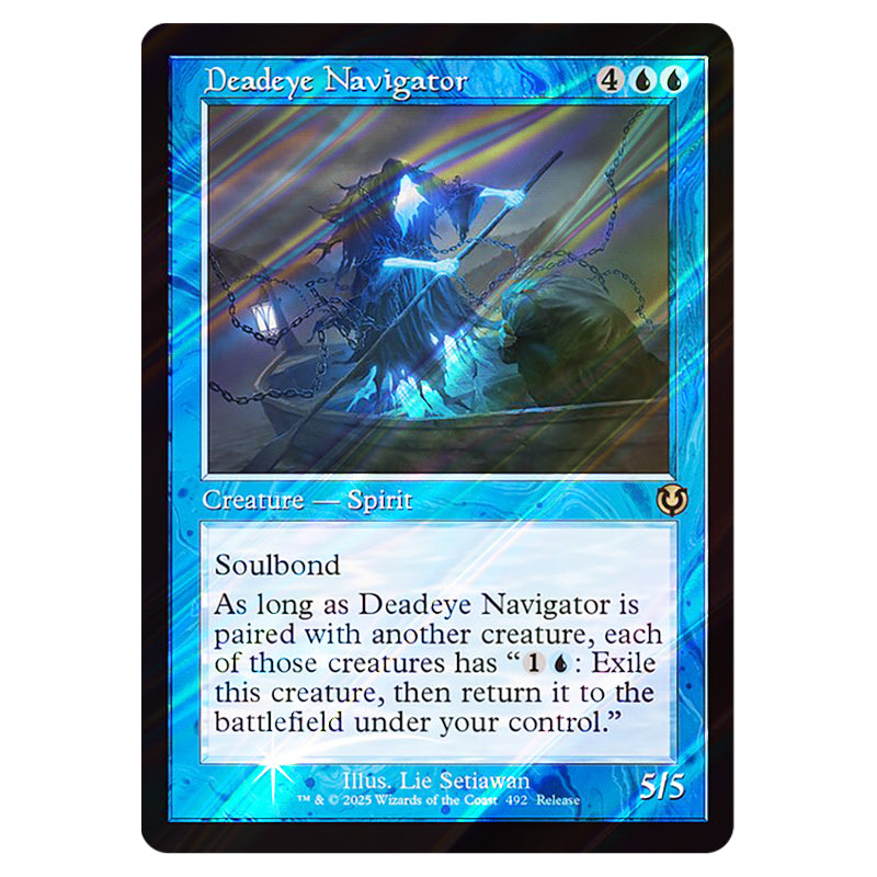 Soulbond (You may pair this creature with another unpaired creature when either enters. They remain paired for as long as you control both of them.) As long as Deadeye Navigator is paired with another creature, each of those creatures has "{1}{U}: Exile this creature, then return it to the battlefield under your control."