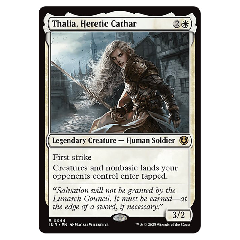 Thalia, Heretic Cathar is a Rare, Legendary Creature - Human Soldier card from the Magic The Gathering set Innistrad Remastered (MTGSC-INR-044)