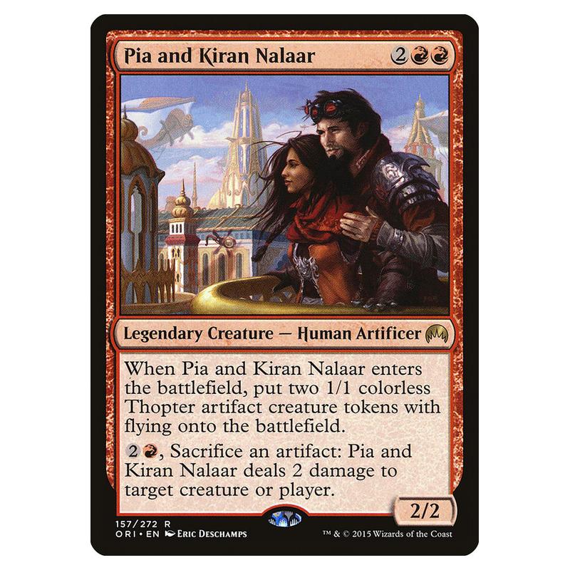 When Pia and Kiran Nalaar enters, create two 1/1 colorless Thopter artifact creature tokens with flying.{2}{R}, Sacrifice an artifact: Pia and Kiran Nalaar deals 2 damage to any target.