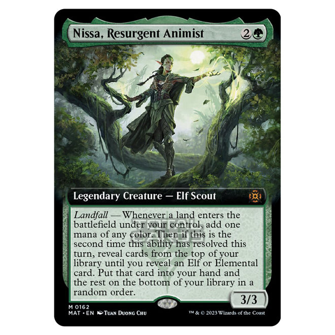 Nissa, Resurgent Animist (Extended Art Card) is a mythic, Legendary Creature - Elf Scout card from the Magic The Gathering set March of the Machine - The Aftermath (MTGSC-MAT-0162)