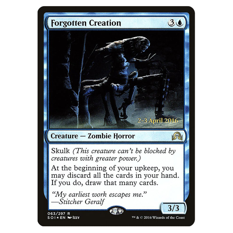 Forgotten Creation is a Rare, Creature - Zombie Horror card from the Magic The Gathering set Shadows Over Innistrad Promos (MTGSC-PSOI-63s)