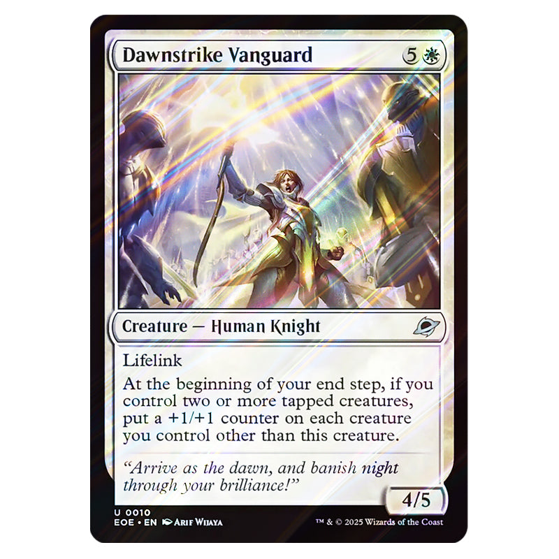 Dawnstrike Vanguard is a Uncommon, Creature - Human Knight card from the Magic The Gathering set Edge of Eternities (MTGSC-EOE-0010)