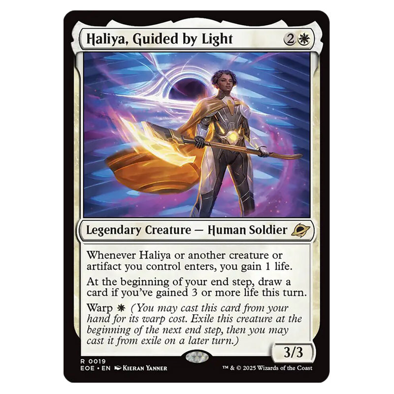Haliya, Guided by Light is a Rare, Legendary Creature - Human Soldier card from the Magic The Gathering set Edge of Eternities (MTGSC-EOE-0019)