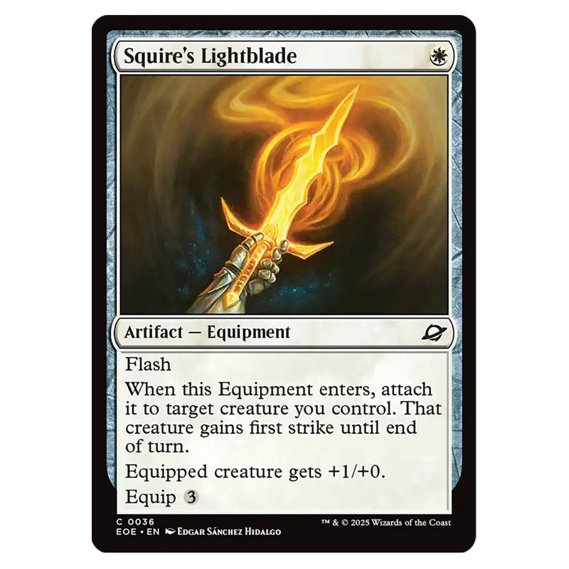 Squire's Lightblade is a Common, Artifact - Equipment card from the Magic The Gathering set Edge of Eternities (MTGSC-EOE-0036)