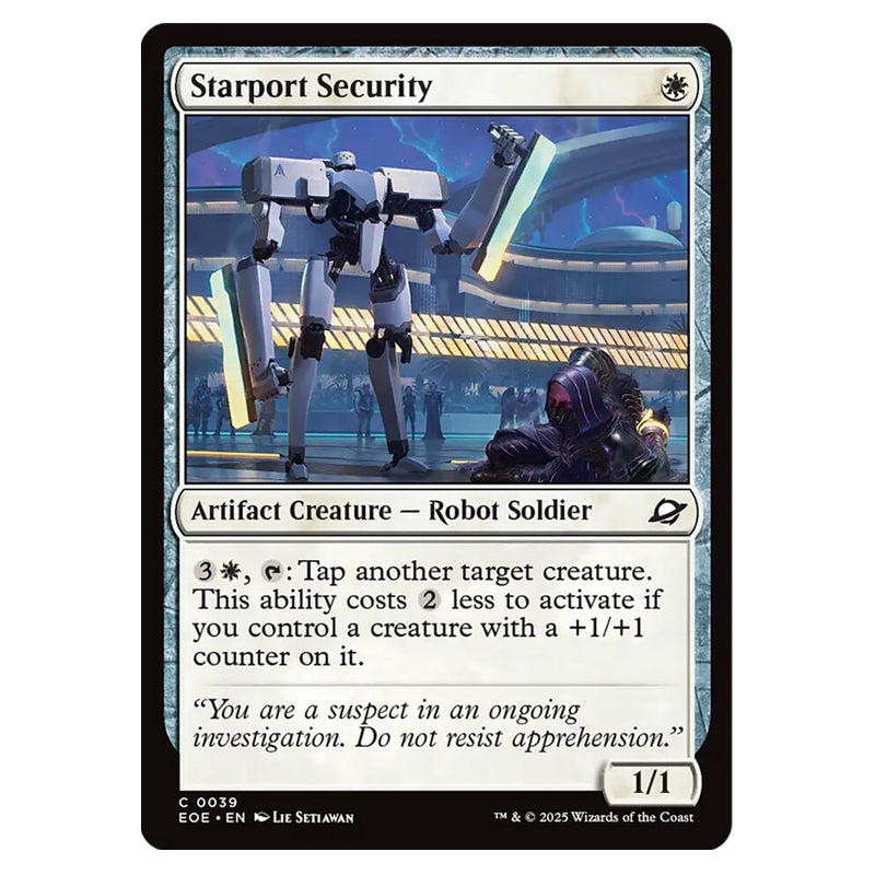 Starport Security is a Common, Artifact Creature - Robot Soldier card from the Magic The Gathering set Edge of Eternities (MTGSC-EOE-0039)