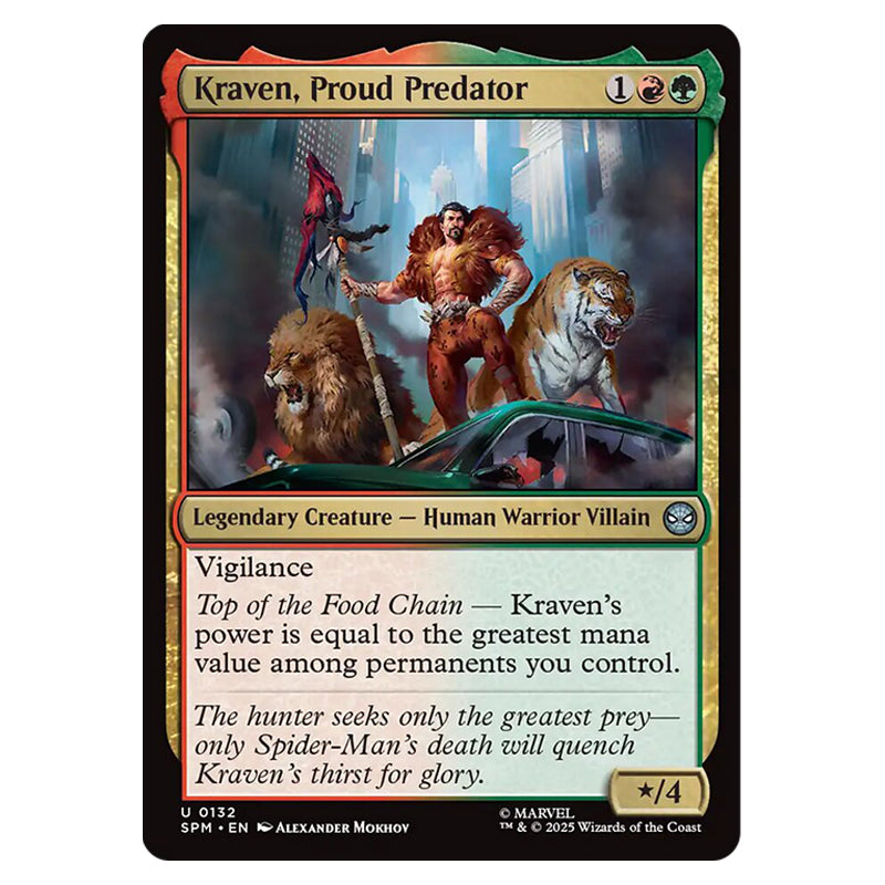 Kraven, Proud Predator is a Uncommon, Legendary Creature - Human Warrior Villain card from the Magic The Gathering set Marvel's Spider-Man (MTGSC-SPM-0132)