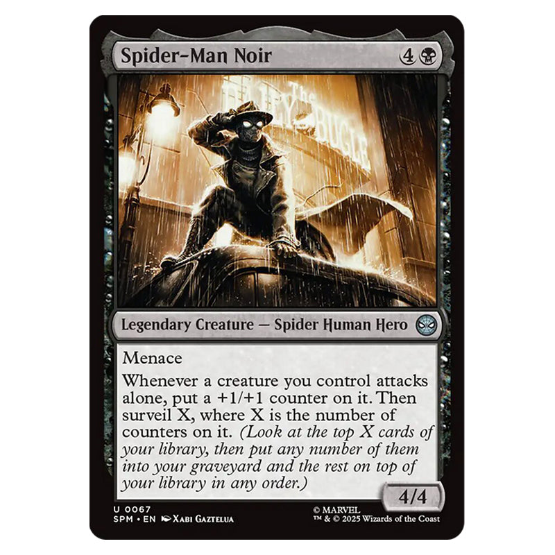 Spider-Man Noir is a Uncommon, Legendary Creature - Spider Human Hero card from the Magic The Gathering set Marvel's Spider-Man (MTGSC-SPM-0067)