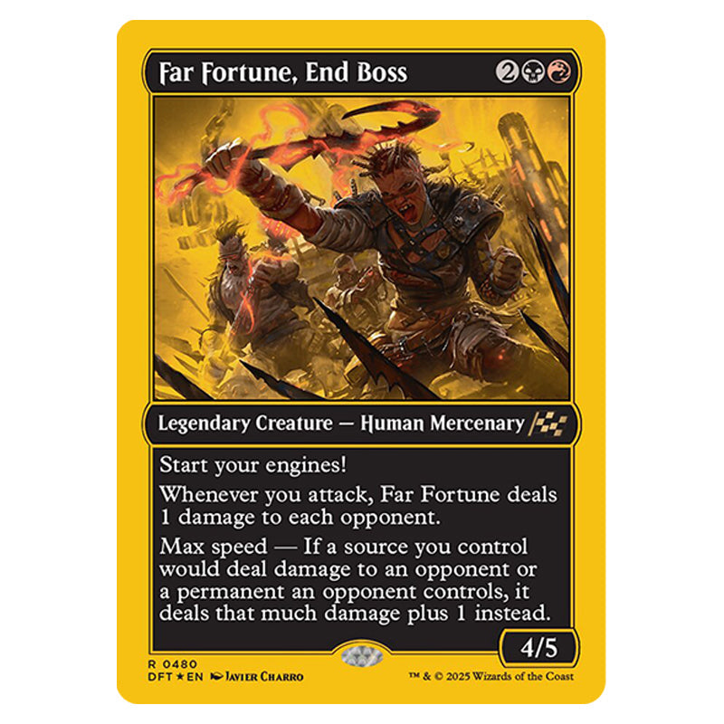 Far Fortune, End Boss is a Rare, Legendary Creature - Human Mercenary card from the Magic The Gathering set Aetherdrift (MTGSC-DFT-0480)