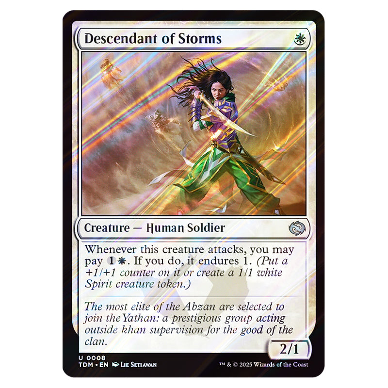 Descendant of Storms is a Uncommon, Creature - Human Soldier card from the Magic The Gathering set Tarkir: Dragonstorm (MTGSC-TDM-0008)