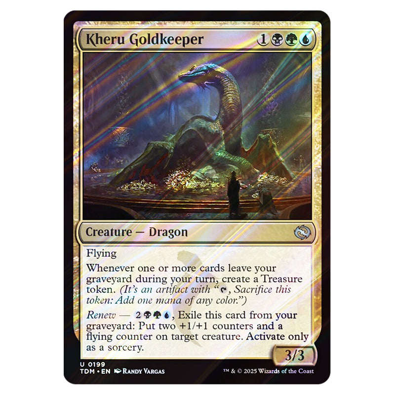 Kheru Goldkeeper is a Uncommon, Creature - Dragon card from the Magic The Gathering set Tarkir: Dragonstorm (MTGSC-TDM-0199)