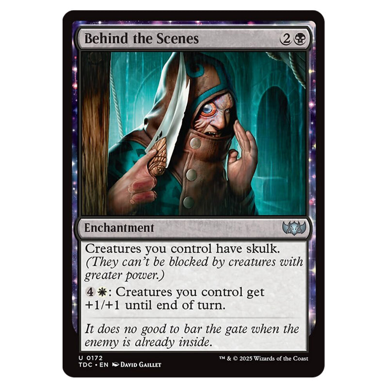 Behind the Scenes is a Uncommon, Enchantment card from the Magic The Gathering set Tarkir: Dragonstorm Commander (MTGSC-TDC-0172)