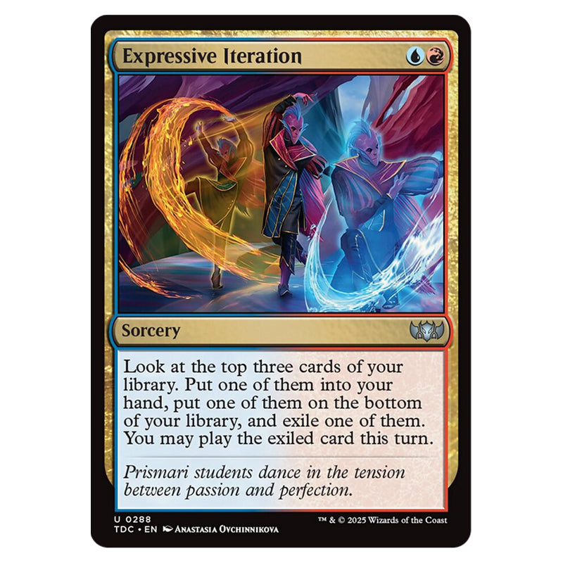 Expressive Iteration is a Uncommon, Sorcery card from the Magic The Gathering set Tarkir: Dragonstorm Commander (MTGSC-TDC-0288)