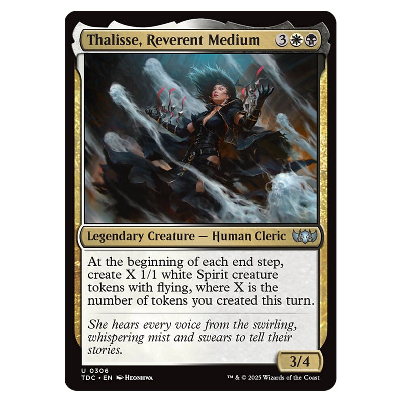 Thalisse, Reverent Medium is a Uncommon, Legendary Creature - Human Cleric card from the Magic The Gathering set Tarkir: Dragonstorm Commander (MTGSC-TDC-0306)