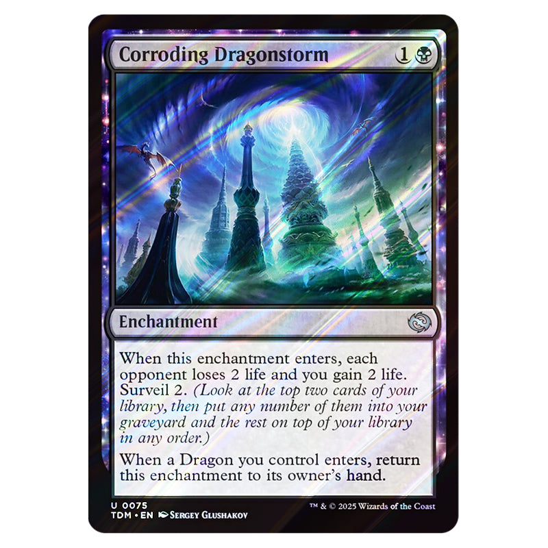 Corroding Dragonstorm is a Uncommon, Enchantment card from the Magic The Gathering set Tarkir: Dragonstorm (MTGSC-TDM-0075)