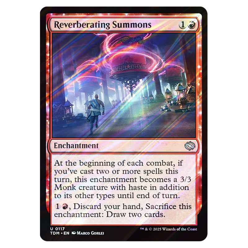 Reverberating Summons is a Uncommon, Enchantment card from the Magic The Gathering set Tarkir: Dragonstorm (MTGSC-TDM-0117)