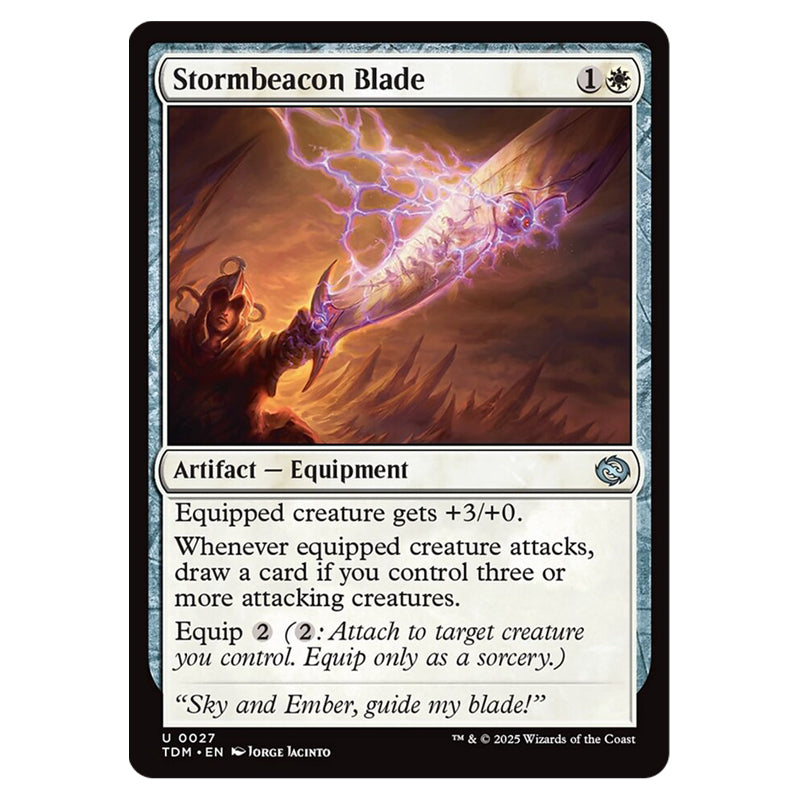 Stormbeacon Blade is a Uncommon, Artifact - Equipment card from the Magic The Gathering set Tarkir: Dragonstorm (MTGSC-TDM-0027)