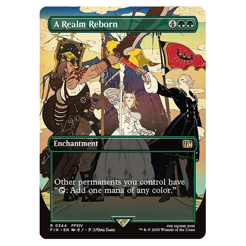A Realm Reborn is a Rare, Enchantment card from the Magic The Gathering set Universes Beyond - Final Fantasy (MTGSC-FIN-0344)