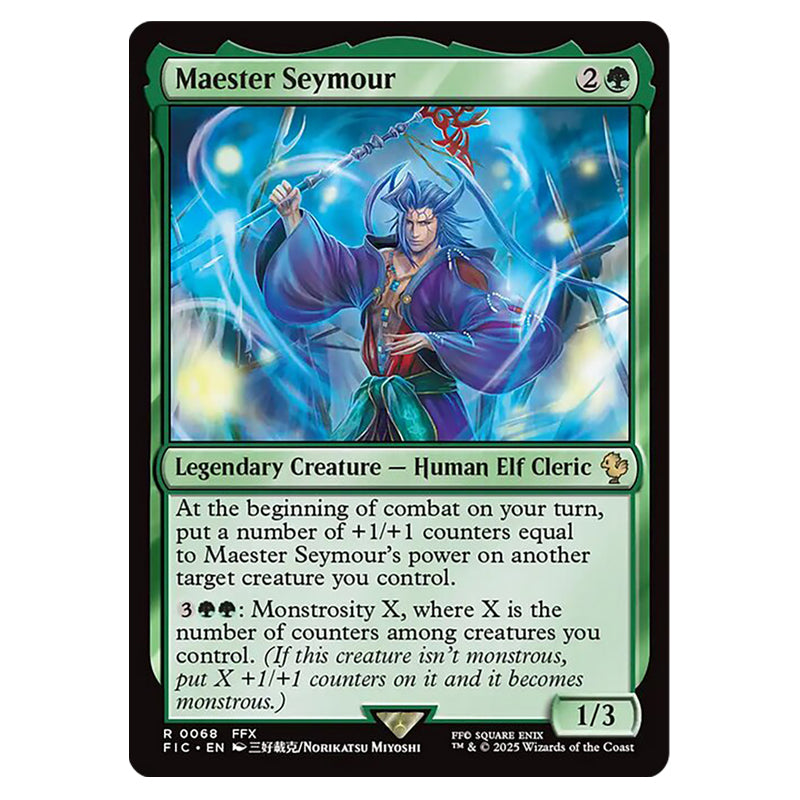 Maester Seymour is a Rare, Legendary Creature - Human Elf Cleric card from the Magic The Gathering set Universes Beyond - Final Fantasy - Commander (MTGSC-FIC-0068)
