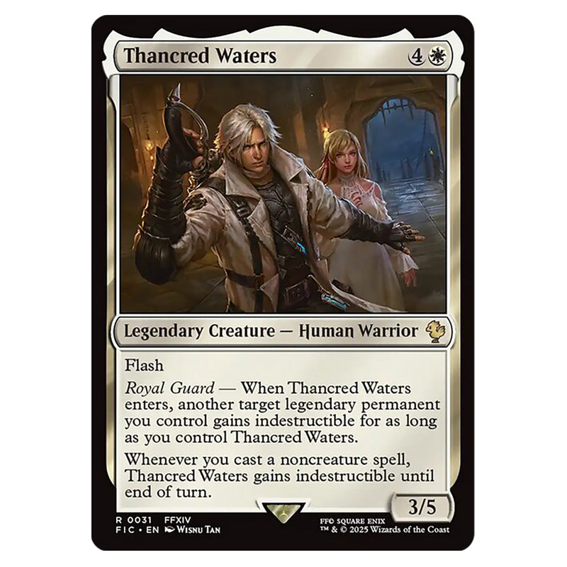 Flash Royal Guard — When Thancred Waters enters, another target legendary permanent you control gains indestructible for as long as you control Thancred Waters. Whenever you cast a noncreature spell, Thancred Waters gains indestructible until end of turn.