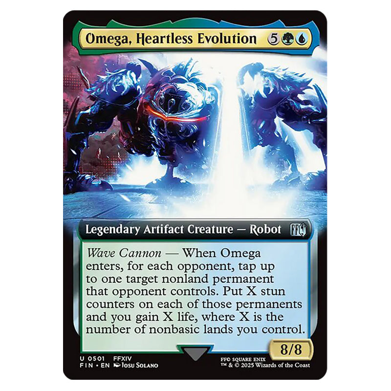 Omega, Heartless Evolution is a Uncommon, Legendary Artifact Creature - Robot card from the Magic The Gathering set Universes Beyond - Final Fantasy (MTGSC-FIN-0501)